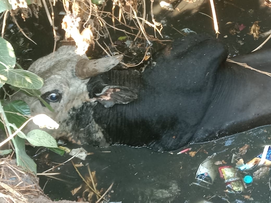 खुले सैप्टिक टैंक में सांड गिरा जेसीबी मशीन से आधा घंटे की मशक्कत के बाद सकुशल निकाला गया