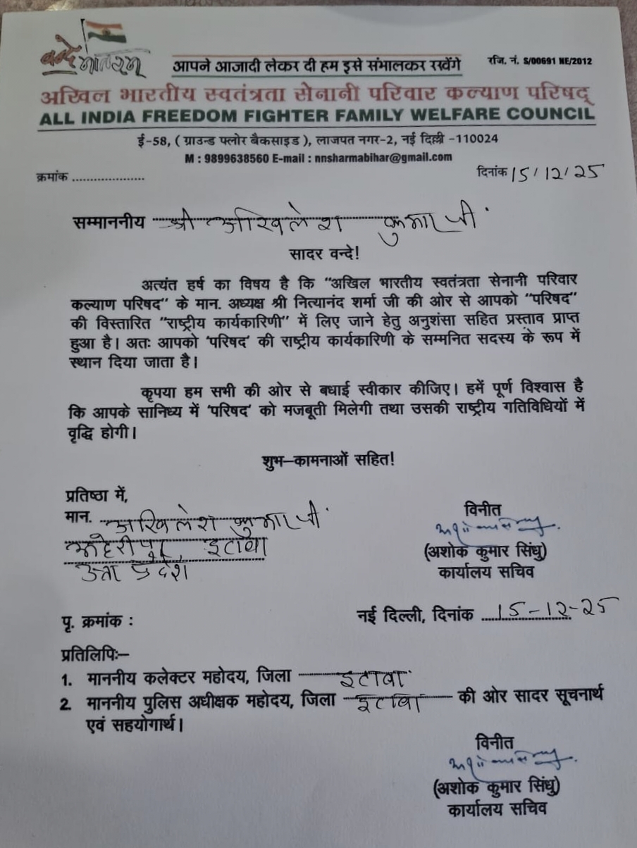 अखिल भारतीय स्वतंत्रता सेनानी परिवार कल्याण परिषद की राष्ट्रीय कार्यकारिणी में इटावा के अखिलेश कुमार को मिली जिम्मेदारी