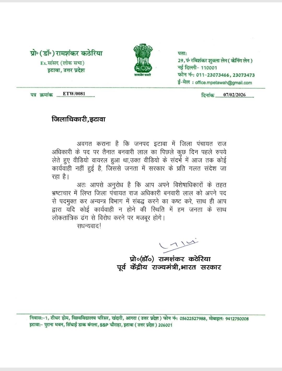 पूर्व केंद्रीय राज्यमंत्री प्रो. (डॉ.) रामशंकर कठेरिया ने जिलाधिकारी को पत्र लिखकर डीपीआरओ बनवारी लाल के खिलाफ कार्रवाई की मांग की है। उन्होंने कहा कि कुछ दिन पहले रिश्वत लेने का वीडियो सोशल मीडिया पर वायरल हुआ था, लेकिन अब तक कोई ठोस कार्रवाई नहीं की गई है।