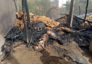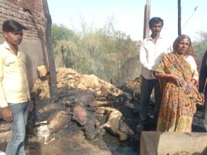 झोपड़ी में बांधी एक भैंस और दो बकरी एक बकरा सहित रखा हुआ गृहस्ती का सामान जलकर राख।