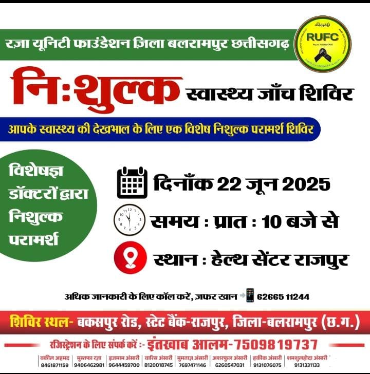 बलरामपुर, 20 जून 2025/ रजा युनिटी फाउंडेशन, जिला बलरामपुर (छत्तीसगढ़) की ओर से दिनांक 22 जून 2025 को एक नि:शुल्क स्वास्थ्य जांच शिविर का आयोजन किया जा रहा है। यह शिविर प्रातः 10:00 बजे से प्रारंभ होगा तथा इसका आयोजन स्थल बकसपुर रोड, स्टेट बैंक के पास, नगर पंचायत राजपुर, जिला बलरामपुर रहेगा।