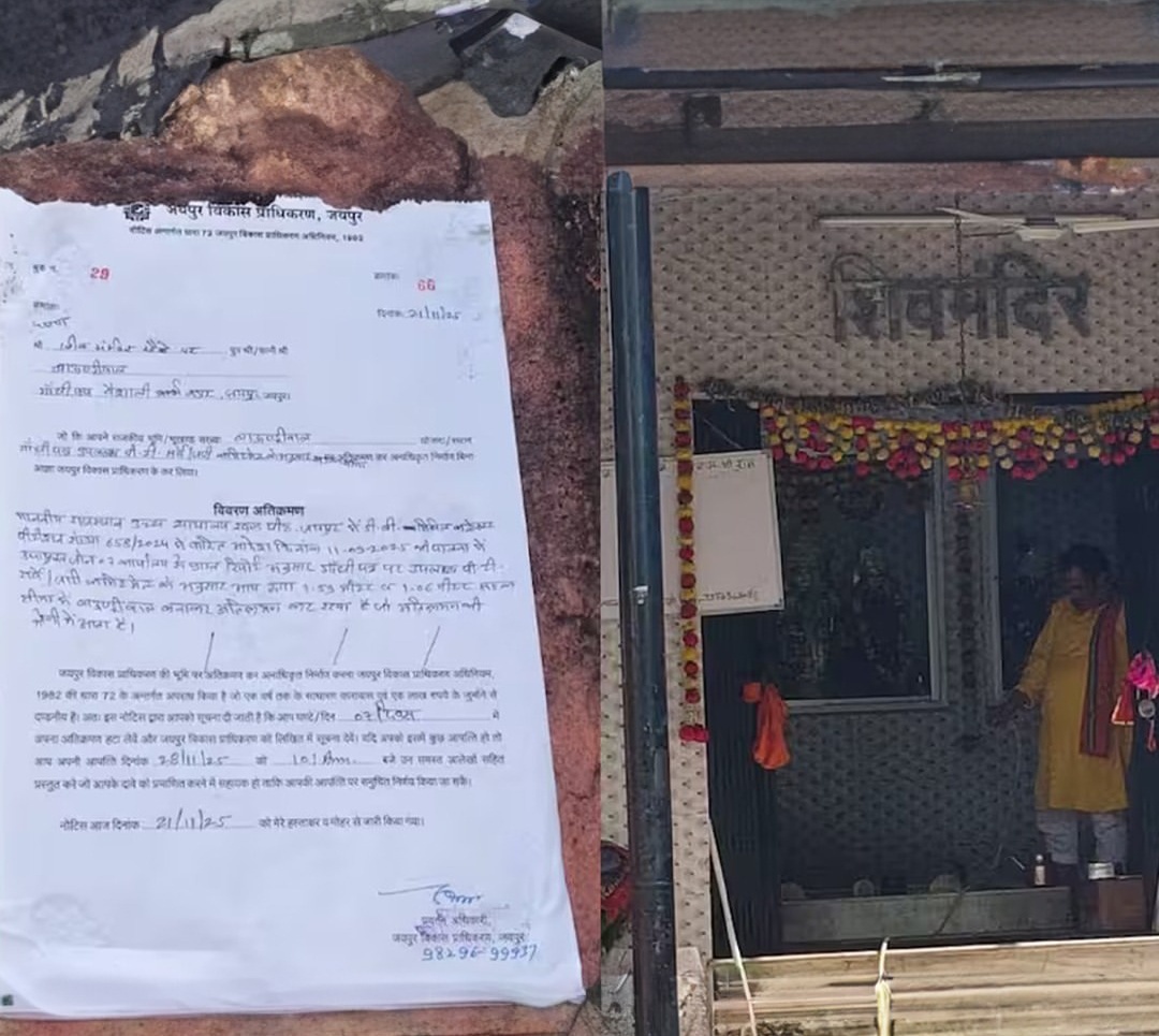 जयपुर। शहर के वैशाली नगर क्षेत्र में जयपुर विकास प्राधिकरण (JDA) की कार्रवाई ने सभी को चौंका दिया है। सड़क चौड़ीकरण अभियान के तहत जहां दुकानों और मकानों को नोटिस दिए गए, वहीं शिव मंदिर को भी सीधा अतिक्रमण का नोटिस चस्पा कर दिया गया।